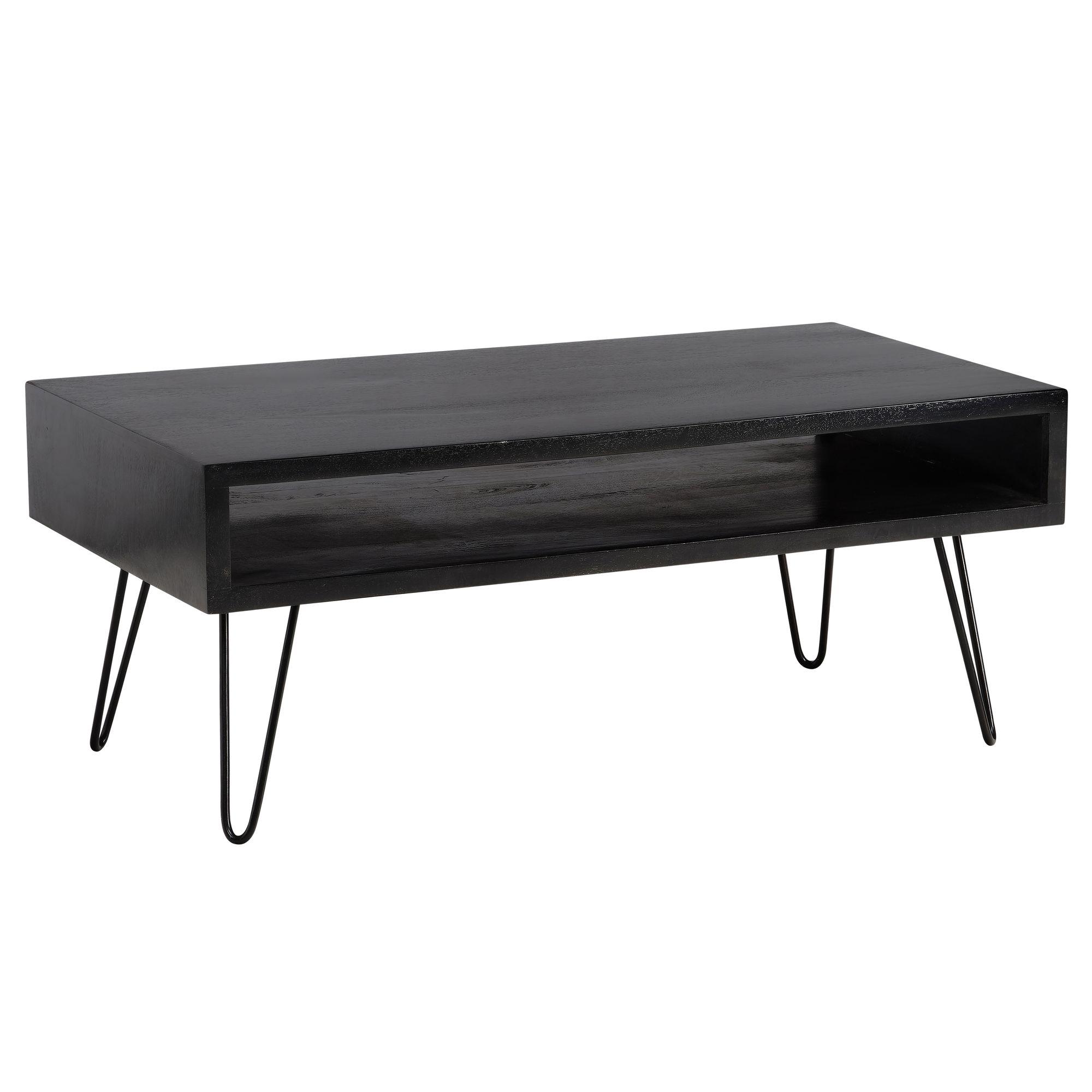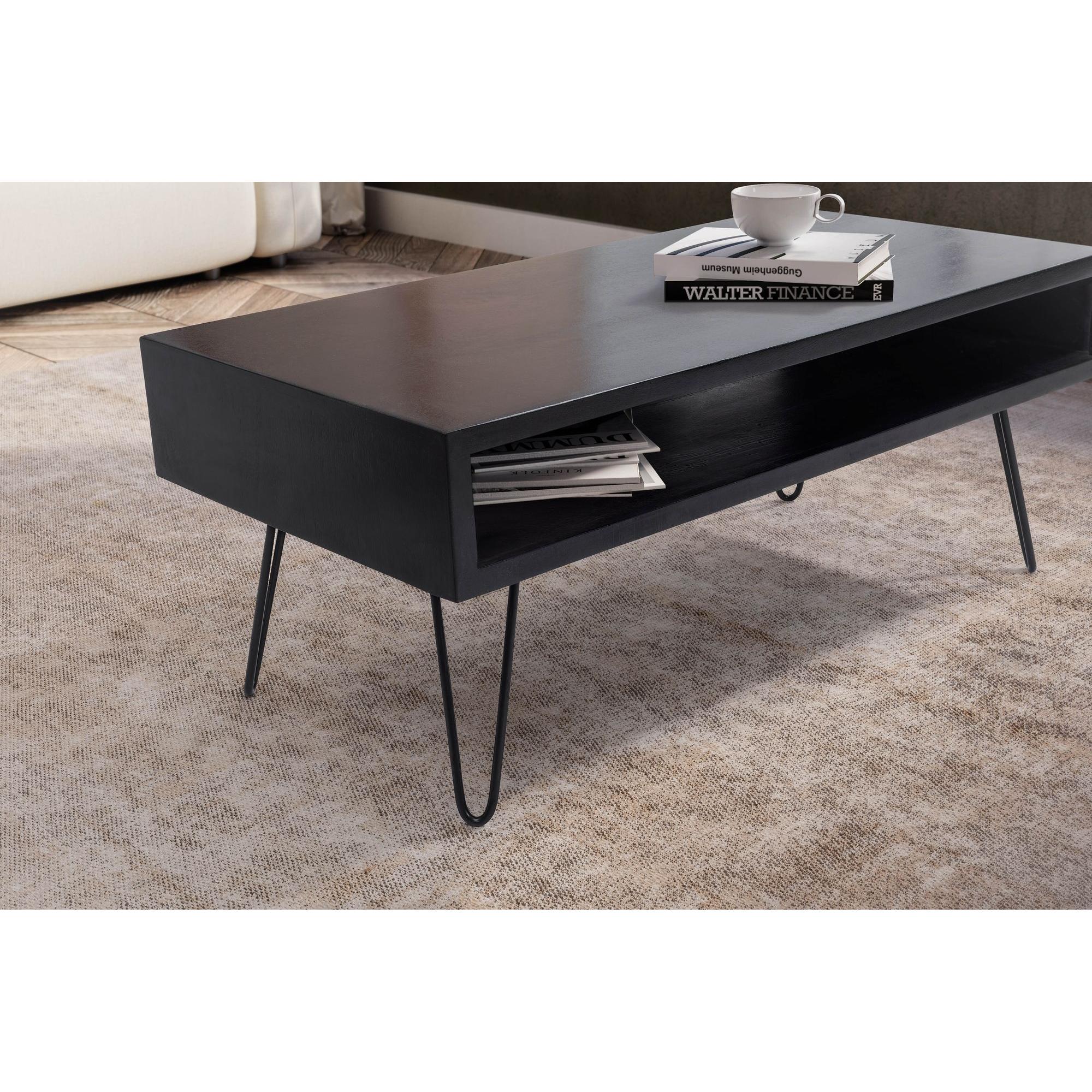 Dette elegante sofabord kombinerer robust træ med stilfulde metalben, hvilket skaber et moderne og tidløst design. Den sorte overflade giver en sofistikeret kontrast til de slanke, hårnålsformede ben, hvilket gør det til et perfekt midtpunkt i enhver stueindretning. Kombinationen af materialer skaber en harmonisk blanding, der tilføjer et strejf af karakter og varme til rummet. Sofabordet er praktisk designet med en rummelig overflade og en åben hylde nedenunder, hvilket giver rigelig plads til opbevaring af magasiner, bøger eller dekorationer. Den åbne hylde giver også mulighed for at tilføre personlige detaljer uden at skabe rod, hvilket gør det nemt at holde orden i stuen. Dette gør bordet både funktionelt og æstetisk tiltalende.
